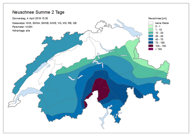 Am Mittwoch war es im Süden, im Jura, im Oberwallis und im Engadin meist bewölkt. Weiter nördlich war es mit mässigem Südföhn zeitweise sonnig. Vor allem am Oberwalliser Alpenhauptkamm und im nördlichen und mittleren Tessin fiel Niederschlag. Die Schneefallgrenze lag zunächst bei 1600 bis 2000 m. Am Mittwochabend intensivierten sich die Stauniederschläge im Süden und in der Nacht auf Donnerstag griffen sie auch auf die nördlichen Gebiete über. Die Schneefallgrenze sank im Norden bis in tiefe Lagen, im Süden und im Osten lag sie bei 1200 bis 1500 m. Insgesamt fielen vom Dienstag- bis Donnerstagnachmittag im Süden, im Gotthardgebiet und in der Zentralschweiz 70 bis 100 cm, gebietsweise bis 150 cm Schnee oberhalb von rund 2000 m (Abbildung 3).
