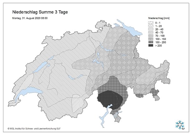 Zum Abschluss des meteorologischen Sommers gab einen kräftigen Vorgeschmack auf den Herbst. Am Freitag, 28.08. war es Norden mit Föhn teils noch sonnig, am Nachmittag kamen dort erste Regengüsse auf. Im Süden gab es bereits am Freitagmorgen Schauer und Gewitter. Am Samstag, 29.08. regnete es dann im ganzen Land, wobei die Niederschläge von Gewittern begleitet waren. Im Süden kamen sehr grosse Regenmengen zusammenkamen (Bilanz des Unwetters, Bericht von MeteoSchweiz). Abbildungen 3 und 4 zeigen die gefallenen Niederschlags- und Neuschneemengen.