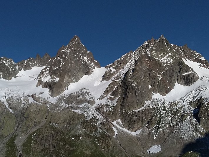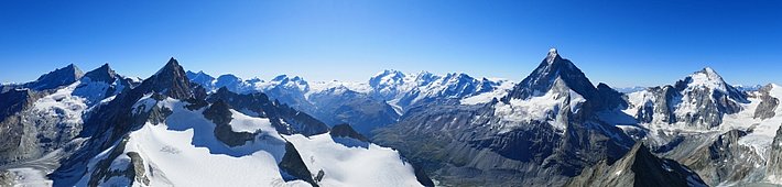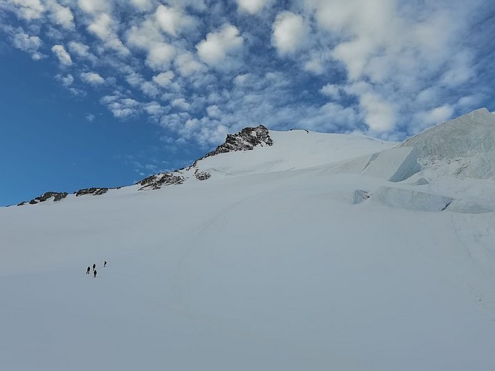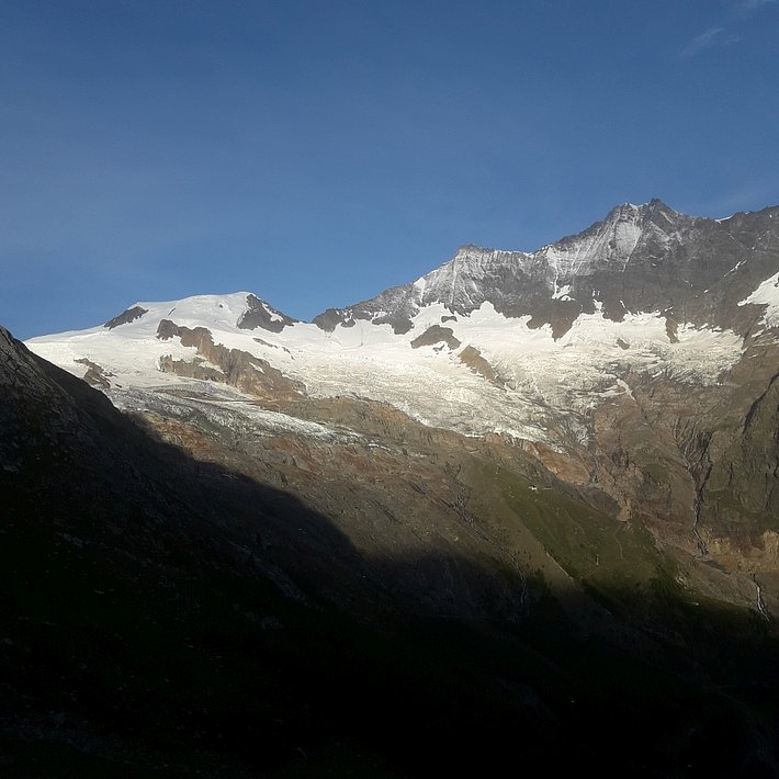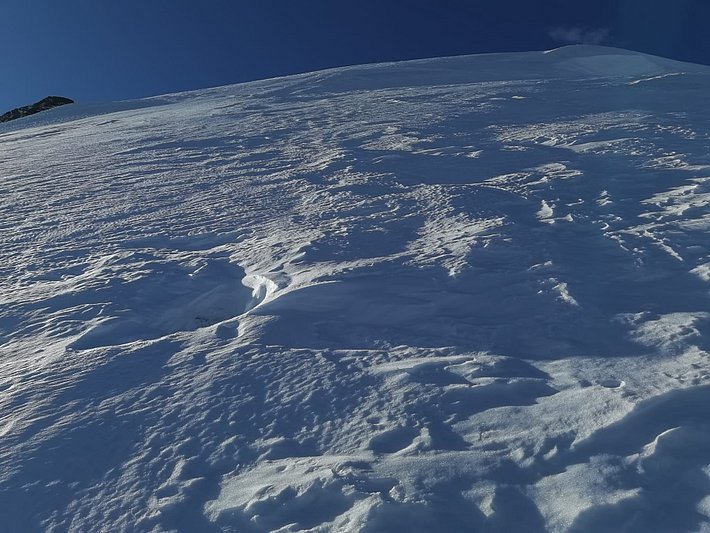 Die Verhältnisse für Hochtouren waren vor allem wetterbedingt oft günstig. Nach den Schneefällen von Anfang August wurden einzelne feuchte Rutsche und Schneebrettlawinen gemeldet (vgl. Bildstrecke). Im Hochgebirge war kurzzeitig guter Trittschnee vorhanden. Dieser schmolz aber im Verlauf der sehr warmen ersten Augusthälfte weitgehend wieder ab, sodass in der zweiten Augusthälfte (vor den Niederschlägen ab 28.08.) meist nur in den höchsten Gipfelregionen des Hochgebirges noch Altschnee vorhanden war (vgl. Bildstrecke). Ansonsten war die Oberfläche der Gletscher meist hart und rau verfirnt, und sie bildete für den Neuschnee von Ende August eine günstige Unterlage. Unterhalb von 3200 m fiel der Neuschnee auf apere Gletscher (Abbildung 5, vgl. auch Bildstrecke).
