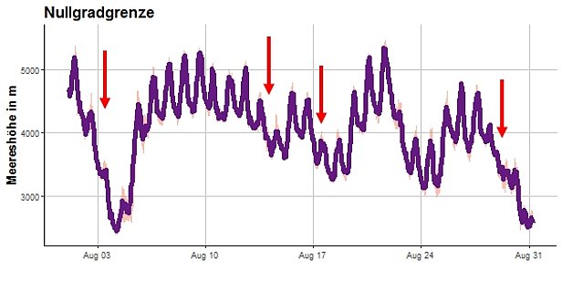 Von Mittwoch, 19.08. bis Freitag, 21.08. stiegen die Temperaturen mit Südwind wieder auf hochsommerliche Werte an (Abbildung 1), und es war sonnig mit nur geringer Quellwolkenbildung im Tagesverlauf. Ab Samstag, 22.08. nahm dann die Schauer- und Gewittertätigkeit wieder etwas zu und am Sonntag, 23.08. war es im Osten meist bewölkt. Die Nullgradgrenze sank auf 4000 m im Westen und auf 3400 m im Osten. Am Montag, 24.08. setzte sich von Westen her wieder stabiles Sommerwetter durch und es war bis am Donnerstag, 27.08. sonnig und sehr warm (Abbildung 1).