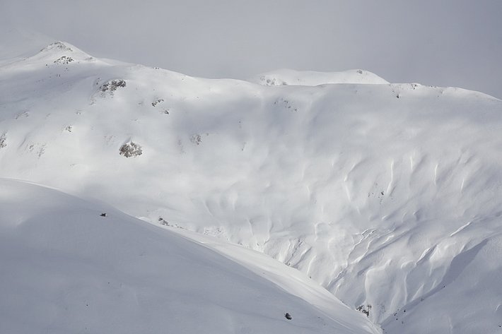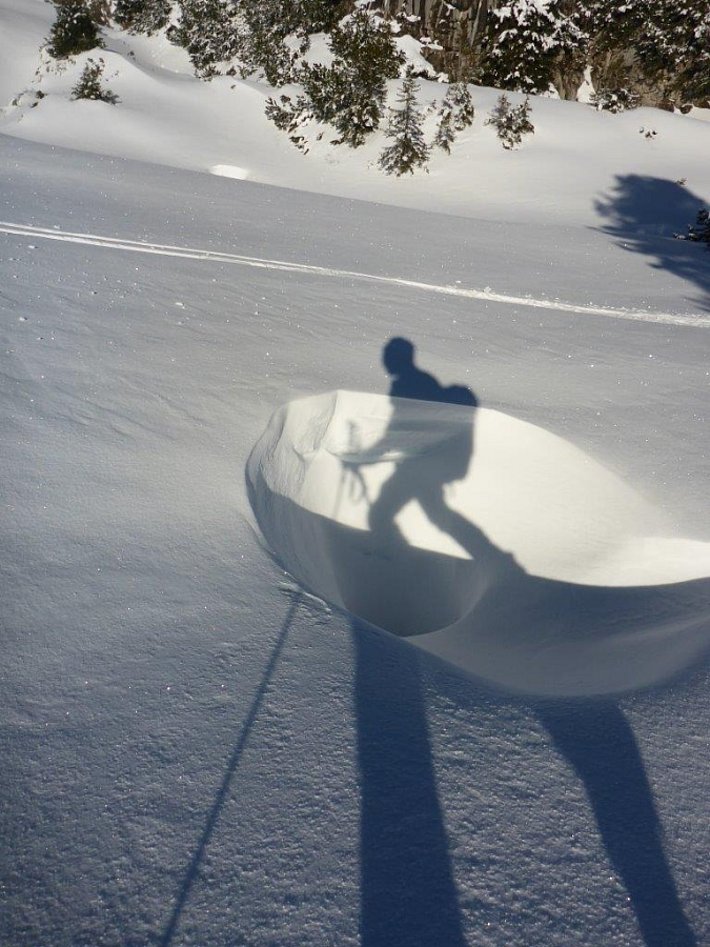 Auch in dieser Wochenberichtsperiode nagte zum Teil starker Wind an der Schneeoberfläche (vgl. Abbildung 5). Der wenige Neuschnee vom Samstag, 04.01. sowie kantig aufgebaute, oberflächennahe Schneeschichten wurden verfrachtet. Viel lockerer Schnee war aber nicht vorhanden, ausser noch in ausgeprägt windgeschützten Lagen. Damit wurde nur wenig Schnee verfrachtet. V.a. wo er auf kantigen Schnee abgelagert wurde, war der Triebschnee zum Teil leicht auslösbar. Lawinen waren jedoch klein (vgl. Abb. 6). Vor allem zum Ende der Wochenberichtsperiode beeinflusste der Wind die Lawinengefahr aber nicht mehr wesentlich.