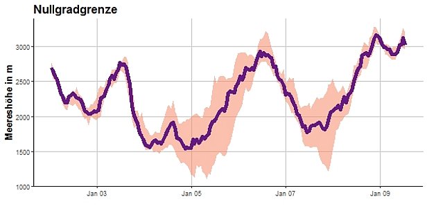 Am Sonntag und Montag war es in den Bergen sonnig (vgl. Abbildung 3) und am Montag besonders im Westen mild (vgl. Abbildung 2). Dort erreichten die Temperaturen am Mittag auf 3000 m +3 °C, im Süden und Osten lagen sie bei -2 °C. Der Nordwind blies in der Nacht auf Sonntag am Nördlichen Alpenkamm in der Höhe und am Alpenhauptkamm stark bis stürmisch, am Montag dann schwach und drehte auf West.