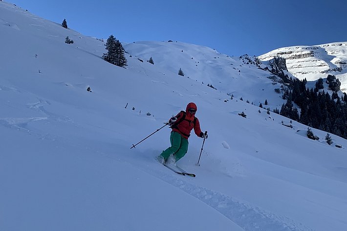 An steilen Sonnenhängen lag verbreitet eine brüchige, zum Teil sogar tragende Schmelzharschkruste, die an den milden Tagen über Mittag aufsulzte.