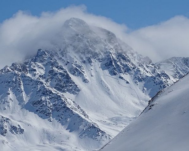 Video 1: Spontane, sehr grosse Schneebrettlawine am Nordosthang der Garda Bordon (3309 m, Anniviers, VS). Die Lawine wurde wahrscheinlich durch einen Wächtenabbruch verursacht. Der Staub drang bis in den Talboden und in die Nähe touristischer Infrastruktur vor. Es kam aber niemand zu Schaden (Video: Webcam geopraevent.ch, 07.03.2020).