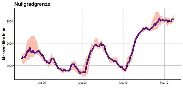 Am Montagmorgen setzte erneut Schneefall ein. Die Schneefallgrenze lag vorerst bei rund 1000 m. Tagsüber gab es im Westen und Süden einige Aufhellungen, sonst hielten die Schneeschauer an. Nach einer kurzen Pause in der Nacht auf Dienstag setzte erneut Schneefall ein. Die Schneefallgrenze lag am Dienstagmorgen noch bei 800 m und stieg im Norden im Tagesverlauf bis auf 2400 m an. Lokal wurden sogar Regenspuren auf 2700 m beobachtet. In den inneralpinen Gebieten lag die Schneefallgrenze noch länger tief und stieg erst ganz zum Ende des Schneefalls auf rund 2000 m an. Zusammen mit der Schneefallgrenze fuhr auch die Nullgradgrenze Achterbahn (vgl. Abbildung 5).