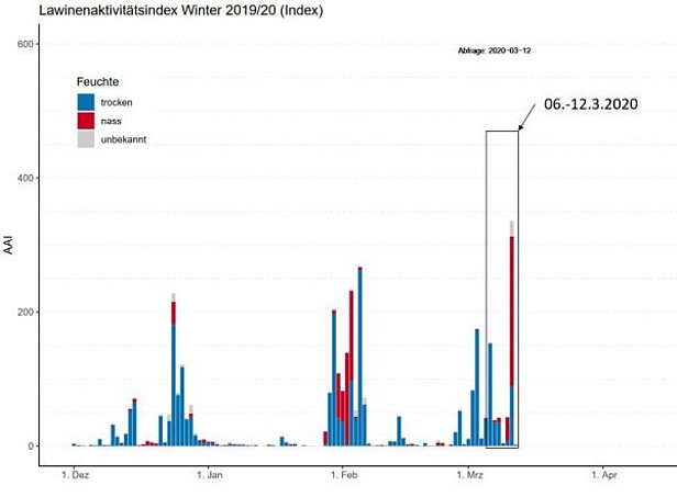 Mit dem Ende der Niederschläge nahm die Wahrscheinlichkeit für spontane Lawinen rasch ab. Aufgrund der mächtigen Neu- und Triebschneeschichten konnten Lawinen aber nach wie vor sehr gross werden. Grund genug, die Gefahrenstufe 4 (gross) im Lawinenbulletin auch während des Tages beizubehalten. Der Lawinenaktivitätsindex verzeichnete für den Freitag, 06.03. denn auch eine markante Spitze (vgl. Abbildung 2), wobei ein Grossteil der Lawinen wohl bereits in der Nacht auf Freitag abgegangen war.