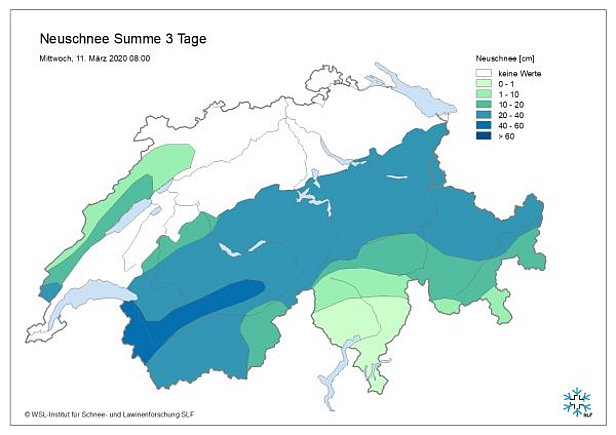 Im Lawinenbulletin wurde die Lawinengefahr in dieser Phase unterschätzt. Zum einen stieg die Schneefallgrenze höher als prognostiziert und zum andern reagierte die Schneedecke deutlich empfindlicher auf den Regen, als dies eingeschätzt wurde. Aufgrund der Lawinenaktivität (vgl. Abbildung 2) wäre in der Nacht von Dienstag, 10.03. auf Mittwoch, 11.03. in weiten Teilen des nördlichen Alpenkamms, des Unterwallis, in Nordbünden und im Unterengadin die Gefahrenstufe gross (Stufe 4) angebracht gewesen.