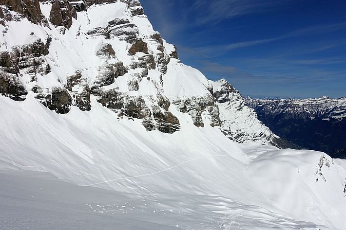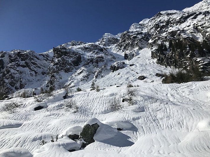 Der lockere Neuschnee wurde in der Höhe verfrachtet und es entstanden störanfällige Triebschneeansammlungen. Diese waren im Osten am grössten und entsprechend wurde die Lawinengefahr dort als erheblich (Stufe 3) prognostiziert. Aufgrund des Windes wurde auch für den Alpenhauptkamm vor erheblicher Lawinengefahr gewarnt. Erheblich war die Lawinengefahr auch im Westen. Die Ursache waren dort nach wie vor die mächtigen Neu- und Triebschneeschichten vom Donnerstag, 05.03. und Freitag, 06.03. Diese wurden nach wie vor als störanfällig eingestuft. Bestätigt wurde dies durch einzelne Lawinenauslösungen durch Personen und einen spontanen Lawinenabgang, vermutlich verursacht durch die grosse Zusatzbelastung eines Wächtenabbruchs (vgl. Video 1).
