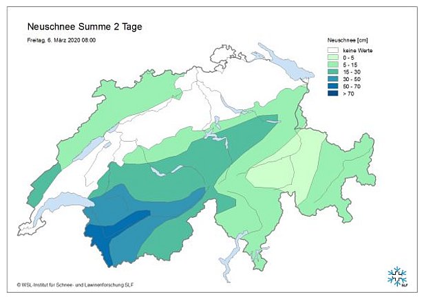In der Nacht auf Freitag endeten die intensiven Schneefälle im Westen. Von Donnerstag, 05.03. bis Freitagmorgen, 06.03. fielen dort bis zu 70 cm Neuschnee (vgl. Abbildung 1).