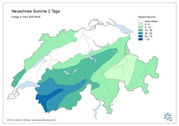 In der Nacht auf Freitag endeten die intensiven Schneefälle im Westen. Von Donnerstag, 05.03. bis Freitagmorgen, 06.03. fielen dort bis zu 70 cm Neuschnee (vgl. Abbildung 1).