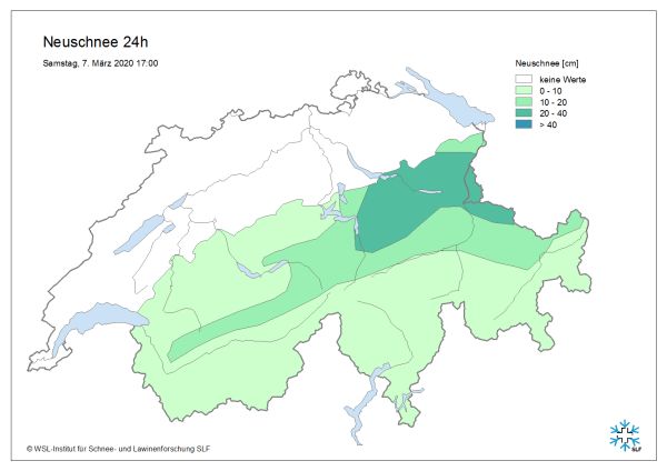 In der Nacht auf Samstag intensivierte sich der Schneefall im Osten. Dort fiel mit bis zu 40 cm etwas mehr Schnee als erwartet (vgl. Abbildung 3). Schwacher Schneefall setzte sich im Osten auch tagsüber fort. Im Westen gab es zunehmend Aufhellungen, im südlichen Wallis und im Tessin war es meist sonnig.
