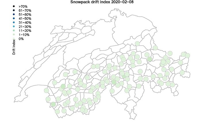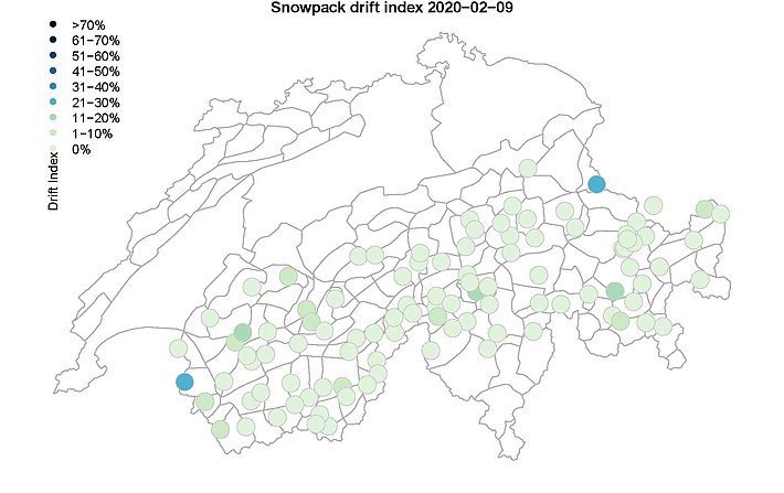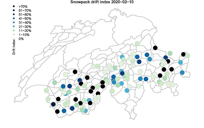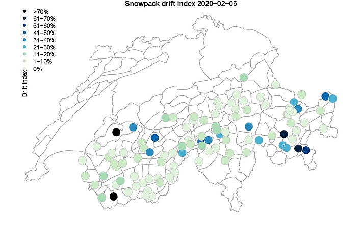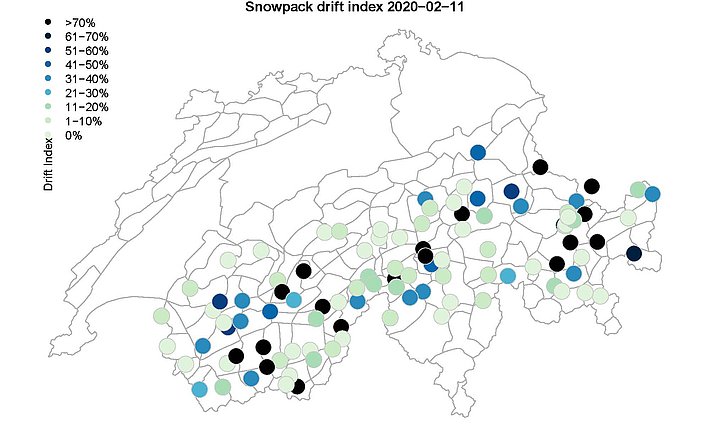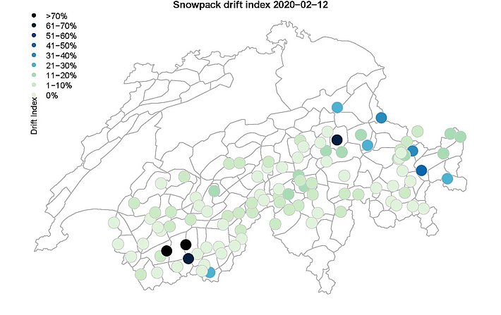 In der Nacht auf Montag, 10.02. erreichte das Sturmtief «Sabine» die Alpen. Das vorherrschende Element am Montag, 10.02. und Dienstag, 11.02. war der Wind, welcher vor allem im Westen und Norden oft stürmisch blies und sowohl den Neuschnee als auch den Altschnee verfrachtete (Abbildung 6). Das Tessin war vor den stärksten Winden abgeschattet, dort blies der Westwind zeitweise mässig.