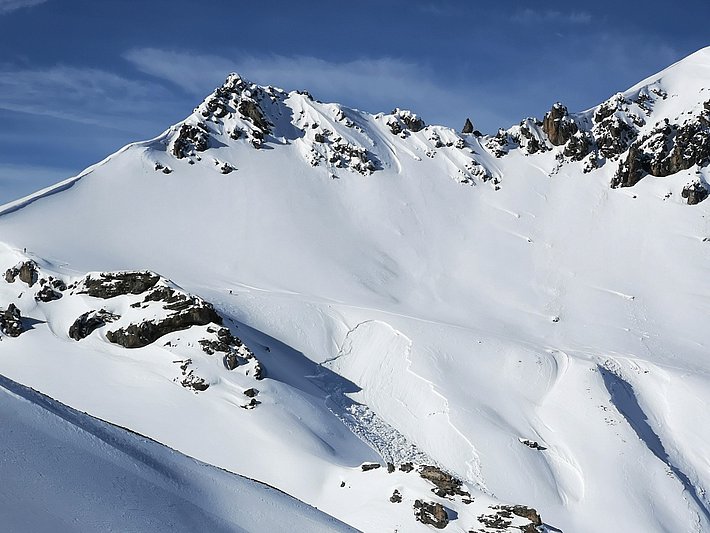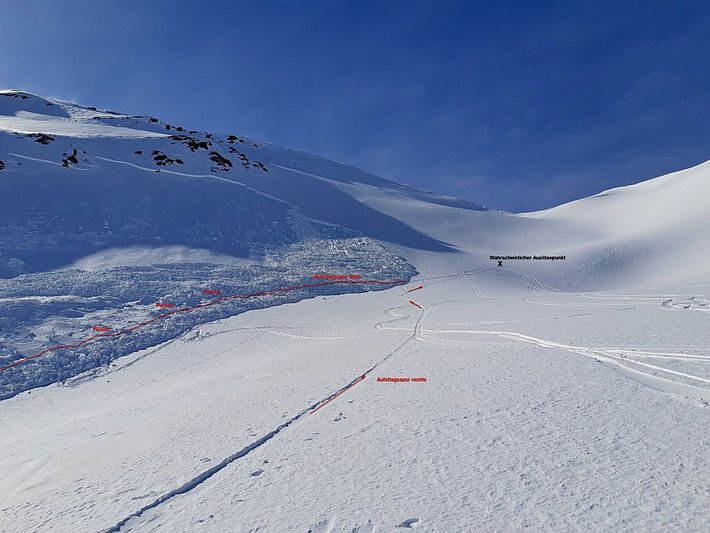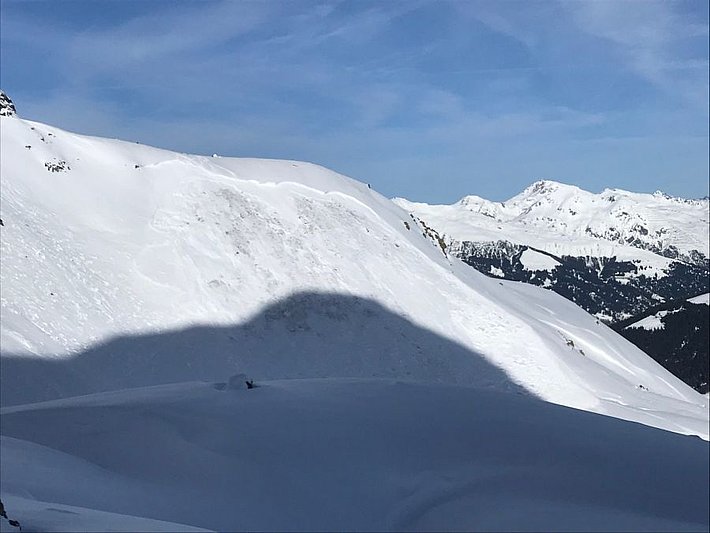 Entgegen der Beruhigung des Triebschneeproblems gab es aber ab Freitag wieder Meldungen von teils grossen Lawinen, die im Altschnee anbrachen. Typisch für Altschneelawinen, waren die Gefahrenstellen kaum erkennbar, nicht sehr zahlreich aber von gefährlicher Grösse. Einmal mehr wurde eindrücklich klar, dass Altschneelawinen sehr gefährlich sein können. Glücklicherweise wurde niemand schlimmer verletzt (Abbildungen 2 und 3).