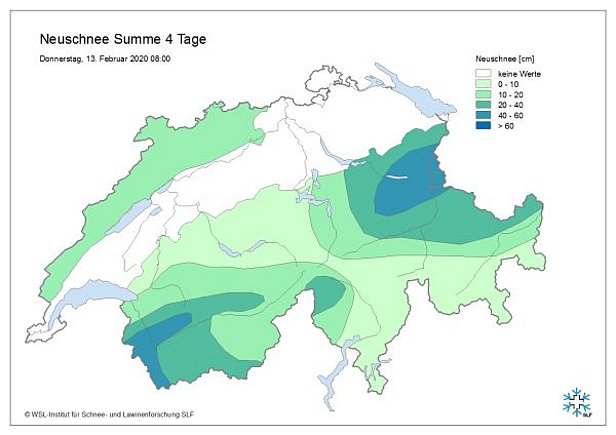Am Mittwoch, 12.02. verlagerte sich der Schwerpunkt des Niederschlags nach Osten. In der Summe fielen vom Montag bis Mittwoch gebietsweise im Unterwallis und am östlichen Alpennordhang 40 bis 60 cm Schnee oberhalb von etwa 2400 m im Westen und oberhalb von etwa 1800 m im Osten. In vielen Gebieten, zum Beispiel am westlichen Alpennordhang oder in Südbünden, fiel nur sehr wenig oder gar kein Schnee (Abbildung 8).