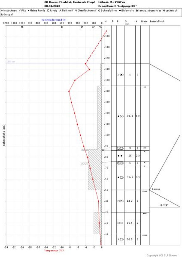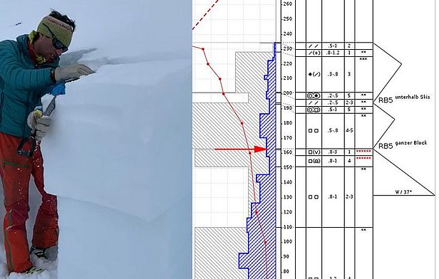Diese Lawinen brachen meist in den Schichten an, die sich in der langen Trockenperiode im Januar an der Schneeoberfläche gebildet hatten. Diese Schwachschicht war inzwischen überdeckt von verschieden Triebschneeschichten und der markanten Kruste, welche sich in der letzten Wochenberichtsperiode mit dem Regen gebildet hatte (Abbildungen 4 und 5). Am heikelsten waren Höhenlagen von etwa 2500 bis 3000 m. Unterhalb von etwa 2500 m war die Regenkruste mehrere Zentimeter dick und recht stabil, so dass in diesen Höhenlagen keine Brüche im Altschnee gemeldet wurden, obwohl auch dort unterhalb der Kruste schwache Schichten vorhanden waren.