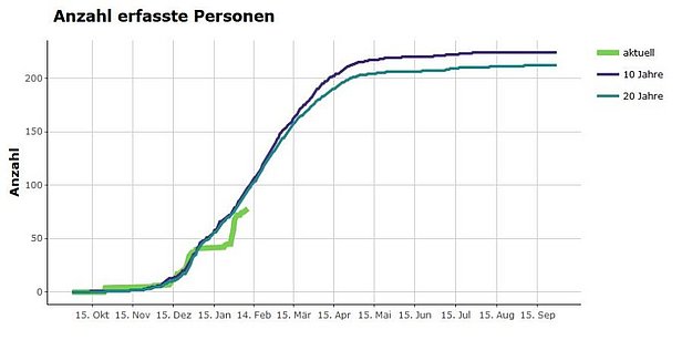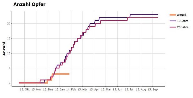 Die bisher drei Lawinenopfer lagen deutlich unter dem Durchschnitt der letzten 20 Jahre (Abbildung 10). Die Anzahl erfasster Personen lag mit 78 erfassten Personen aber nur leicht unter dem Durchschnitt (Abbildung 11). Das deutete darauf hin, dass viele Lawinen glimpflich ausgingen und diese aber trotzdem fleissig dem Lawinenwarndienst des SLF gemeldet wurden – vielen Dank.
