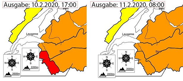Mit dem Sturm setzte auch Niederschlag ein. Am Montag war der Schwerpunkt des Niederschlags vor allem im Westen, wobei die Schneefallgrenze von rund 2500 m auf etwa 1800 sank und damit deutlich höher lag als erwartet. Erst am Dienstag sank die Schneefallgrenze in tiefe Lagen. Die Neuschneemengen blieben am Montag und Dienstag vorerst unter den Erwartungen, weshalb im Lawinenbulletin am Morgen teils Anpassungen vorgenommen werden mussten. So wurde zum Beispiel die am Abend des 10.02. prognostizierte Stufe 4 (gross) für das westliche Unterwallis am Morgen des 11.02. auf Stufe 3 (erheblich) korrigiert, weil sowohl die gefallenen als auch die prognostizierten Neuschneemengen deutlich geringer waren als zuvor angenommen (Abbildung 7).