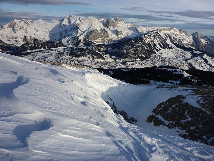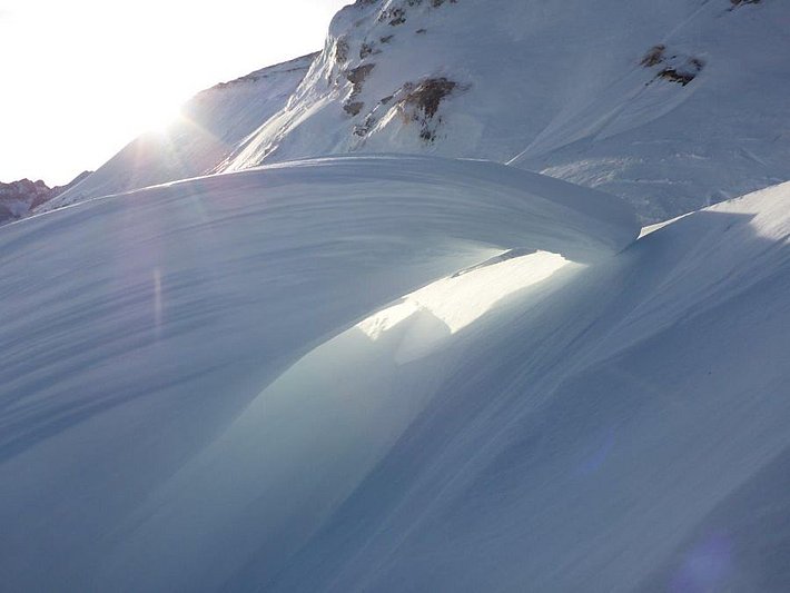 In dieser Wochenberichtsperiode hat der Wind, das himmlische Kind, höllisch gewütet. Bei mehreren Sturmphasen aus West, Nordwest und Südwest mit Föhn wurde viel Schnee verfrachtet – Neuschnee und Altschnee. Besonders am Alpenhauptkamm und nördlich davon ist die Schneedecke von den Stürmen, aber auch von den milden Temperaturen gezeichnet: Kämme und Grate sind abgeblasen. Meist kompakte Triebschneeansammlungen liegen in kammfernen Rinnen und Mulden. Am Alpensüdhang liegt deutlich mehr Schnee und die Schneeverteilung ist gleichmässiger als im Norden. Auch der Schneedeckenaufbau ist dort am günstigsten. In den inneralpinen Gebieten des Wallis und Graubündens ist der Schneedeckenaufbau am schlechtesten – «standesgemäss» hat sich vor allem dort ein Altschneeproblem entwickelt.