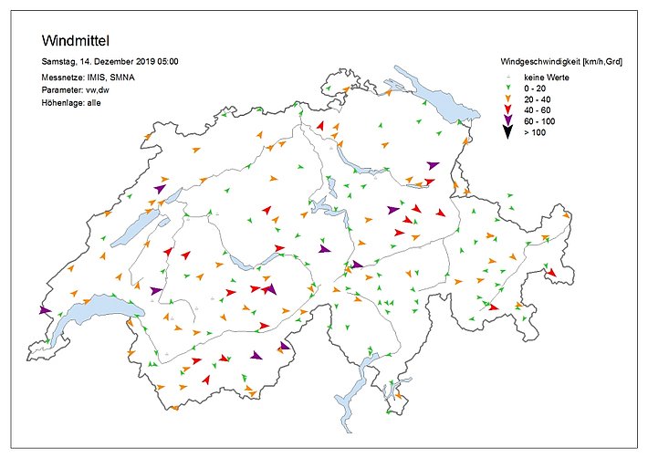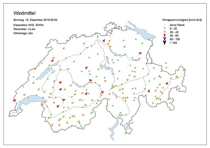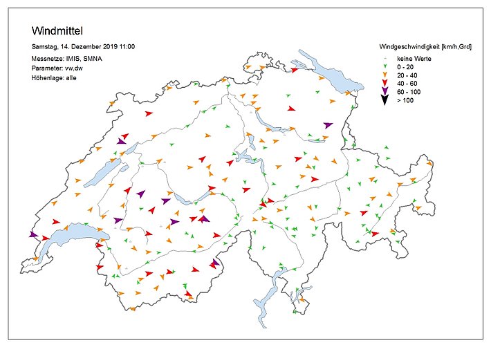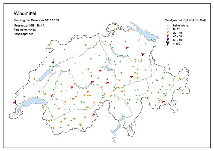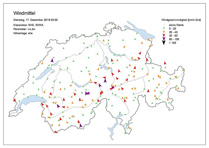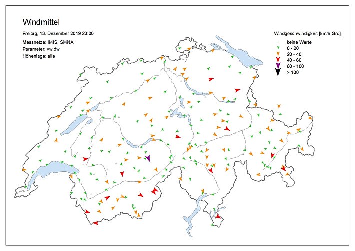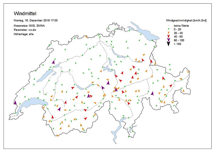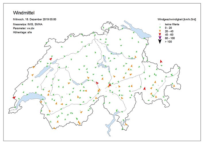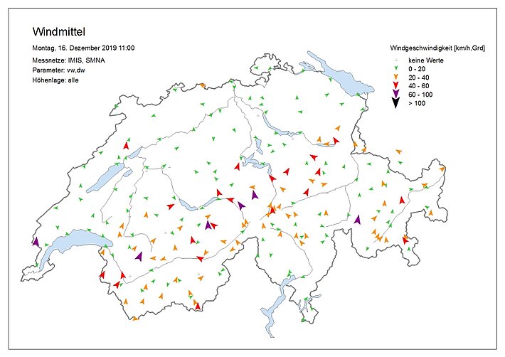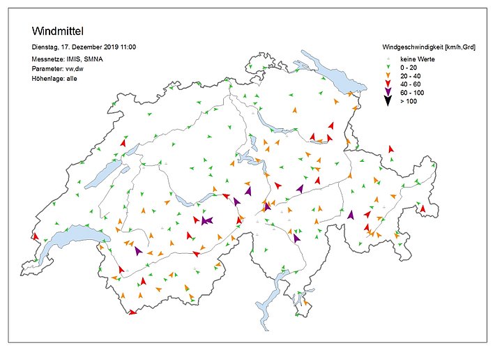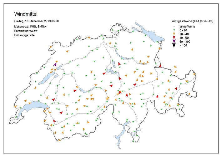 Es war stark bewölkt mit wiederholten Schneefällen vor allem im Westen und Norden. Am Samstag gab es vor allem am Alpensüdhang, in Graubünden und am westlichen Alpennordhang und im Jura Aufhellungen. Im Wallis schneite es gebietsweise noch schwach bis in den Nachmittag hinein. Die Schneefallgrenze lag am Freitag am Alpensüdhang und im Wallis in tiefen Lagen, sonst zwischen 800 und 1200 m. Am Samstag kletterte sie im Jura, den Waadtländer und Freiburger Alpen und im westlichen Unterwallis gegen 2000 m, sonst am Alpennordhang und im Wallis auf rund 1600 m. Am Alpensüdhang und in Graubünden lag sie um 1000 m oder darunter. Der Wind blies stark bis stürmisch aus West bis Nordwest (vgl. Abbildung 1 und 2). Am Alpennordhang kam am Freitag vorübergehend starker Südföhn auf.