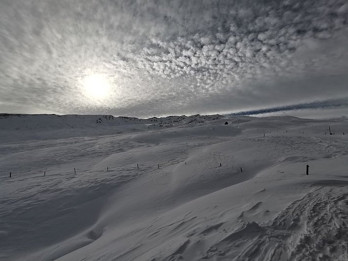Den Neuschnee zu messen und im Gelände zu finden war aufgrund des Sturmes nicht immer einfach. Er wurde zusammen mit Altschnee intensiv verfrachtet (vgl. Abbildung 5) und damit die Schneehöhenverteilen auf kleinem Raum sehr unterschiedlich. Kämme und Rücken waren schneefrei geblasen, dafür sammelten sich an windgeschützten Orten grosse Triebschneemengen an.
