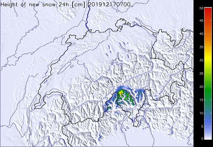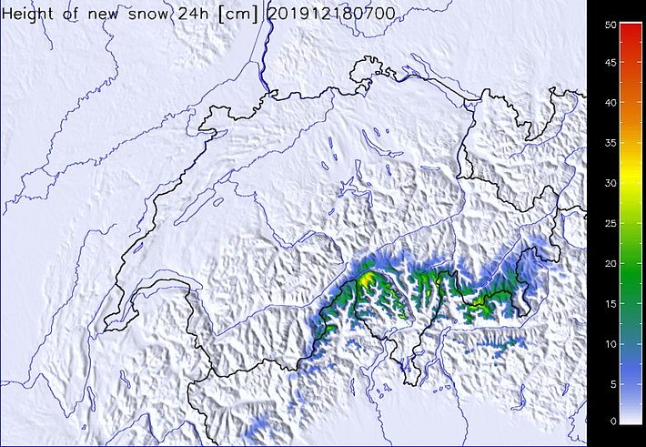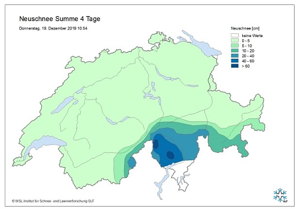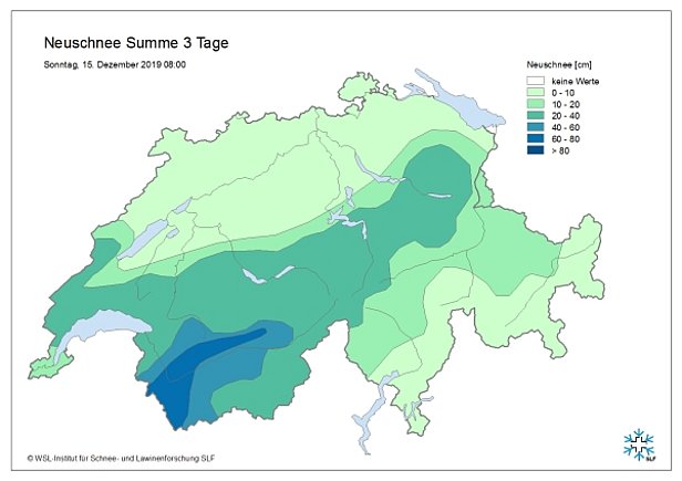 Von Donnerstagnachmittag bis in die Nacht auf Sonntag schneites es im westlichen und nördlichen Unterwallis mit 60 bis 80 cm am meisten (vgl. Abbildung 4). Im Jura und am Alpennordhang sowie in den meisten Gebieten des Oberwallis schneite es 20 bis 40 cm, im Tessin und in Graubünden weniger.