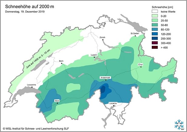 Regen bis auf 2200 m hinauf und der Föhn im Norden führten zu einer deutlichen Schneehöhenabnahme durch Schneeschmelze in tiefen und mittleren Lagen und Setzung in hohen Lagen. Auf 2000 m lagen am Donnerstagmorgen die in Abbildung 12 abgebildeten Schneehöhen.