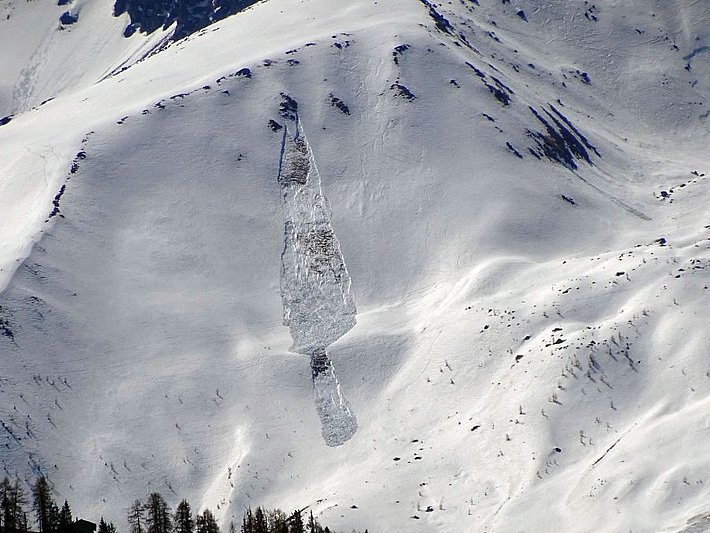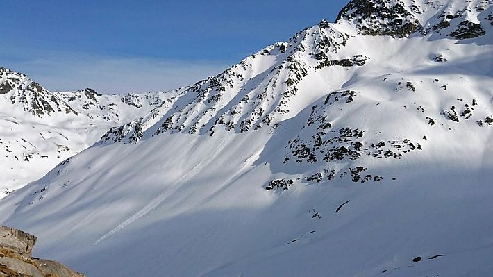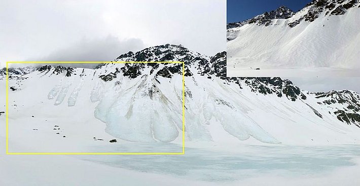 Abb. 6 (Video): Abgang einer Nassschneelawine am Sattelhorn (2979 m, Davos, GR) am Sonntag, 19.04. um den Mittag. Ursprung hat die Lawine in einer Lockerschneelawine unterhalb der Felsen welche dann in der Sturzbahn eine Schneebrettlawine auslöste, die den Schnee bis auf den Boden ausräumte (Film: SLF/ L. Eberhard).
