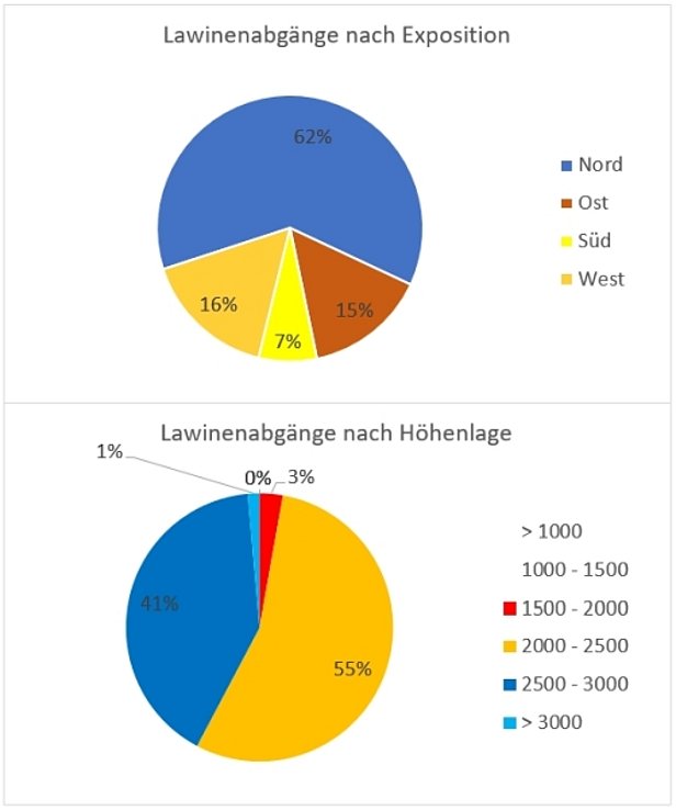 An diesen drei Tagen (ab der Nacht auf Sonntag) gingen vermehrt Nassschneelawinen ab. Am meisten Lawinen wurden aus den Altschneegebieten Graubündens gemeldet, wo oft die ganze Schneedecke ausgeräumt wurde. Dabei gingen die meisten Lawinen an Nordhängen zwischen 2000 und 3000 m ab (vgl. Abbildung 4). Die Lawinen wurden als klein (Grösse 1), mittel (Grösse 2) oder gross (Grösse 3) klassiert.