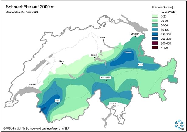 Die Schneeschmelze schritt zügig voran (vgl. Abbildung 7). Auf den Messstationen nahm die Schneehöhe in den letzten zwei Wochen oberhalb von 2000 m meist zwischen 30 bis 50 cm ab. Im Allgemeinen sind die Schneehöhen in hohen Lagen kleiner als sonst um diese Jahreszeit üblich. Auf 2000 m liegen noch die in Abbildung 8 dargestellten Schneemengen.