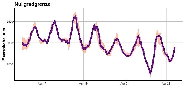 Auch diese Wochenberichtsperiode war mild. Die Nullgradgrenze lag bis am Sonntag, 19.02. zwischen 3000 und 3500 m und sank dann etwas. Insbesondere die Nächte auf den Mittwoch, 22.04. und Donnerstag, 23.04. waren deutlich kälter (vgl. Abbildung 1).