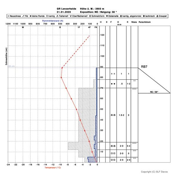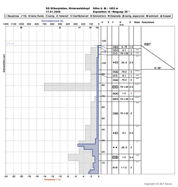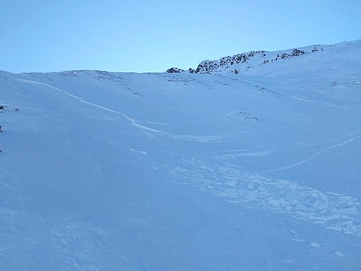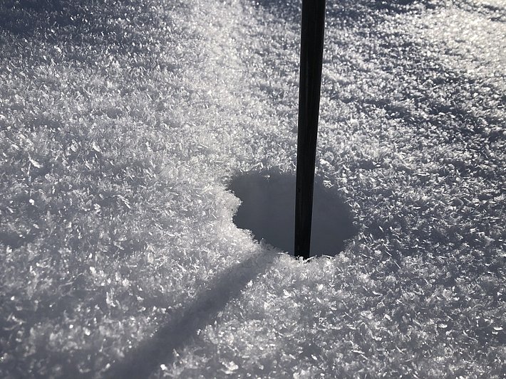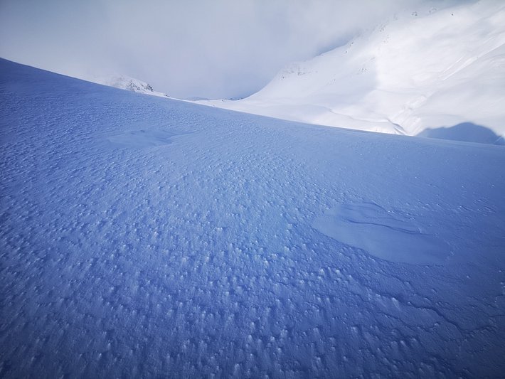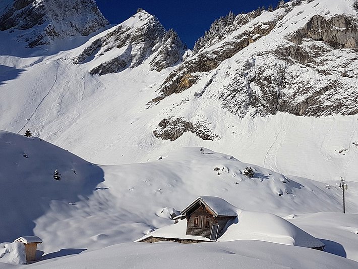 Der Neuschnee fiel mit wenig Windeinfluss und bei tiefen Temperaturen und war deshalb oft sehr locker. Ungebundener Schnee kann trotz Schwachschicht nur schlecht als Schneebrettlawine ausgelöst werden. So wurden am Wochenende nur wenige, meist kleine Schneebrettlawinen gemeldet (Abbildung 5). Während und kurz nach dem Schneefall gingen jedoch vielerorts Lockerschneelawinen ab. Für die Auslösung von Lockerschneelawinen ist kein gebundener Schnee notwendig. Sie breiten sich von einem Auslösepunkt nach unten aus, indem der abrutschende Schnee immer mehr Schnee mitreisst. Erst mit dem mässigen bis starken Föhn und milderen Temperaturen bildeten sich von Montag, 20.01. bis Dienstag 21.01. harte Triebschneeansammlungen (Abbildung 6). Diese konnten an Schattenhängen leicht ausgelöst werden.