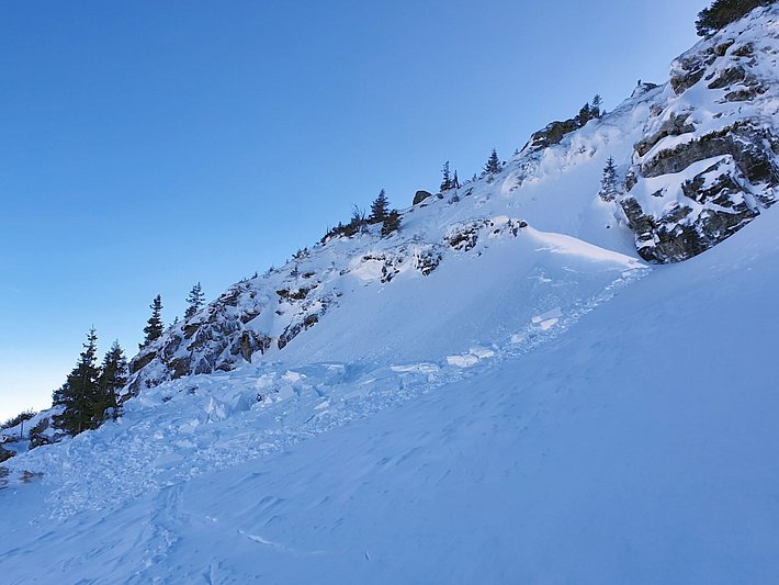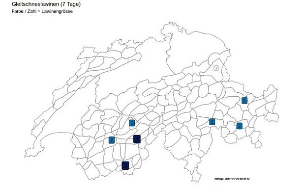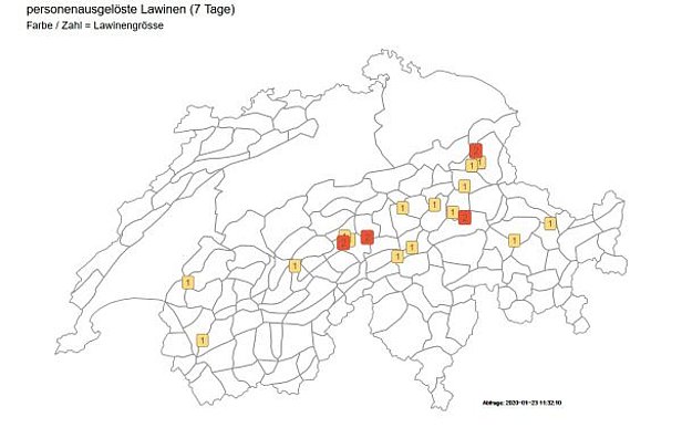 In dieser Berichtsperiode wurden einige Lawinen von Personen ausgelöst (Abbildung 9). Diese waren meist klein und nur vereinzelt mittelgross. Bei einer Lawine am Silberplatten (Nesslau, SG) wurde am Samstag, 18.01. eine Person von einer Lawine mitgerissen. Sie wurde zur Kontrolle ins Spital geflogen.