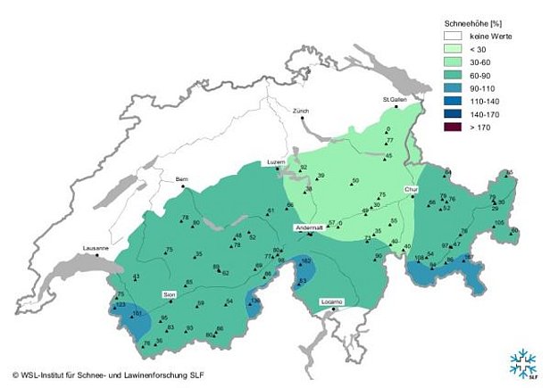 Am 23.01. war die Schneehöhe für die Jahreszeit im Norden unterdurchschnittlich, vor allem am zentralen und östlichen Alpennordhang mit 30 bis 60 % der langjährig gemittelten Schneehöhe teils sogar stark unterdurchschnittlich. Im Süden und ganz im Westen war die Schneehöhe dank der intensiven Schneefälle im November und Dezember teilweise noch durchschnittlich (Abbildung 8).