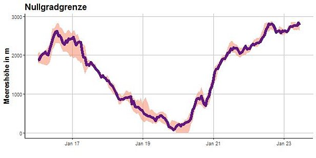 Ab Montag, 20.01. herrschte in den Bergen erneut ausnahmslos Traumwetter. Die Nullgradgrenze stieg wieder auf über 2000 m. Am Montag drehte der Wind auf Süd. In den Alpentälern des Nordens blies bis am Dienstag, 21.01. mässiger bis starker Föhn.