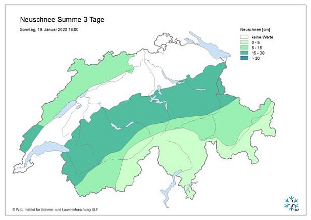 Von Sonntag, 19.01. bis Montagmorgen, 20.01. blies im Jura und in den Voralpen teils starke Bise. Im Osten fiel schauerartig noch etwas Schnee, sonst war es sonnig. Zwischen Freitagnachmittag, 17.01 und Sonntagabend, 19.01 fielen die in Abbildung 2 dargestellten Neuschneemengen.