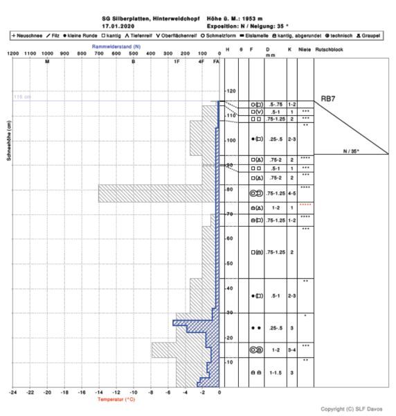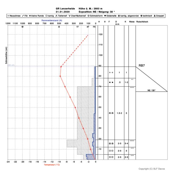 Der Neuschnee fiel mit wenig Windeinfluss und bei tiefen Temperaturen und war deshalb oft sehr locker. Ungebundener Schnee kann trotz Schwachschicht nur schlecht als Schneebrettlawine ausgelöst werden. So wurden am Wochenende nur wenige, meist kleine Schneebrettlawinen gemeldet (Abbildung 5). Während und kurz nach dem Schneefall gingen jedoch vielerorts Lockerschneelawinen ab. Für die Auslösung von Lockerschneelawinen ist kein gebundener Schnee notwendig. Sie breiten sich von einem Auslösepunkt nach unten aus, indem der abrutschende Schnee immer mehr Schnee mitreisst. Erst mit dem mässigen bis starken Föhn und milderen Temperaturen bildeten sich von Montag, 20.01. bis Dienstag 21.01. harte Triebschneeansammlungen (Abbildung 6). Diese konnten an Schattenhängen leicht ausgelöst werden.