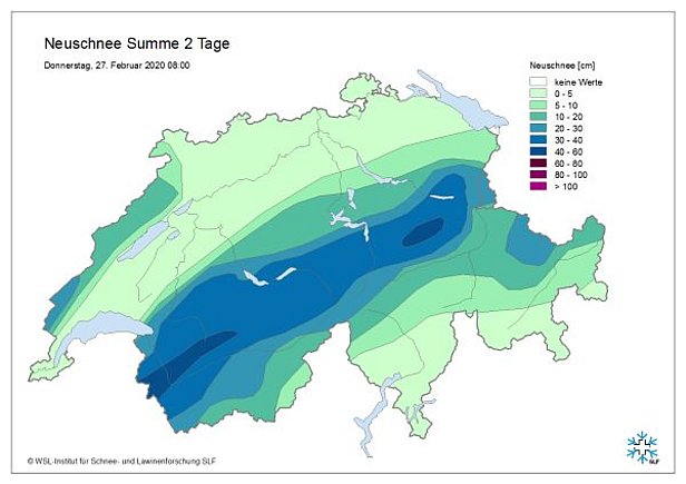 Am Dienstag war es meist stark bewölkt. Im Tagesverlauf setzte im Westen Niederschlag ein. Die Schneefallgrenze lag bei rund 1200 m. Am Mittwoch schneite es im Norden anhaltend, im Osten schauerartig mit Aufhellungen. Die Schneefallgrenze sank bis in tiefe Lagen (Abbildung 5). Im Süden war es meist trocken und recht sonnig. Am Donnerstag war es im Osten am Morgen noch teils sonnig, dann setzten aus Westen rasch die nächsten Schneefälle ein. Vom Dienstagmittag bis Donnerstagmorgen fielen oberhalb von rund 1500 m im Norden verbreitet 30 bis 40 cm, gebietsweise bis 60 cm Schnee (Abbildung 5). Die Lawinengefahr stieg im Westen und Norden verbreitet auf Stufe 3 (erheblich) an. Die Hauptgefahr ging von Schwachschichten im Neu- und Triebschnee aus. Am Donnerstag konnten durch Sprengungen meist kleine und mittlere, vereinzelt aber auch grosse Lawinen ausgelöst werden.