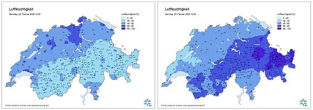 Am Samstag war es nach einer klaren Nacht abgesehen von einigen hohen Wolken sonnig. Es wurde sehr mild, die Nullgradgrenze stieg bis am Abend auf 3000 m (Abbildung 2) und auf 2000 m war es +7 °C im Westen und Süden und +5 °C im Osten. Trotz diesem markanten Temperaturanstieg blieb der Schnee noch meist pulvrig. Ein Faktor, der dies begünstigt hat, war die trockene Luft (Abbildung 3).