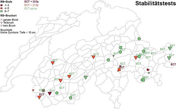 Ein ähnlich günstiges Bild vermittelten auch die durchgeführten Schneedecken-Stabilitätstests: vielfach konnte auch mit grosser Belastung kein Bruch erzeugt werden. Falls Brüche in der Schneedecke erzeugt werden konnten, dann meist in oberflächennahen Schichten, bei mittleren Belastungsstufen und als Teilbruch (Abbildung 2).