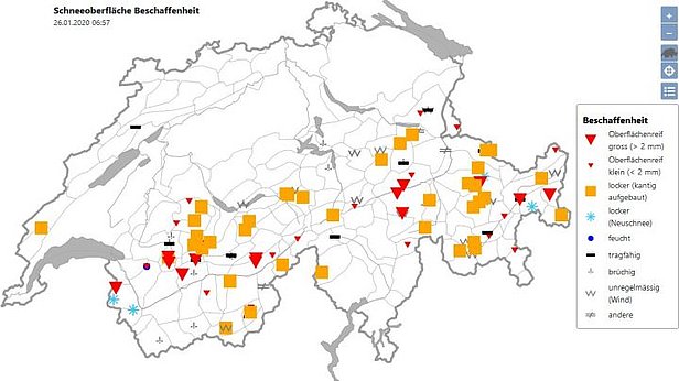 Die Schneeoberfläche präsentierte sich vor den in der Nacht auf Dienstag einsetzenden Schneefällen variabel:
