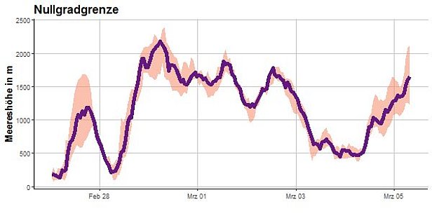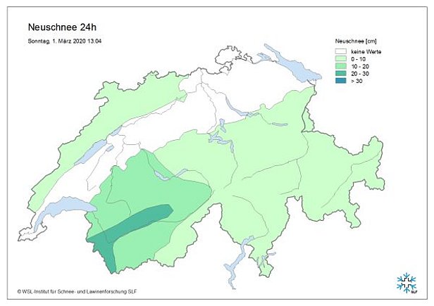 Am Samstag, 29.02. war es mit zunehmendem Südwind im Osten und Süden stark bewölkt, im Westen teilweise sonnig. Im Norden war es mit dem Föhn deutlich milder als am Vortag. Die Nullgradgrenze stieg vorübergehend auf über 2000 m an (Abbildung 2). Mit dem Durchzug einer Kaltfront, fiel in der Nacht auf Sonntag, 01.03. erneut Schnee. Am meisten Neuschnee erhielt wiederum der Westen (Abbildung 3). Dabei blies starker bis stürmischer Westwind. Tagsüber war es meist sonnig und der Wind liess deutlich nach.