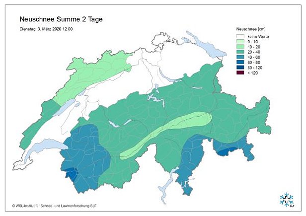 Mit starkem bis stürmischem Wind aus wechselnden Richtungen schneite es in der Nacht auf Montag, 02.03. zunächst vor allem im Westen, tagsüber dann auch am Alpensüdhang. In der Nacht auf Dienstag, 03.03. schneite es auch im Norden intensiv. Tagsüber nahmen Wind und Niederschlag deutlich ab. Insgesamt fiel im Westen und Süden verbreitet rund ein halber Meter Schnee, lokal bis zu 80 cm (Abbildung 4).