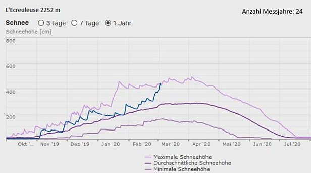 Nach den Schneefällen der vergangenen 2 Wochen sind die Schneehöhen im Vergleich zum langjährigen Mittel im Westen überdurchschnittlich. Sonst sind sie verbreitet durchschnittlich oder leicht unterdurchschnittlich. Am Mittwoch, 04.03. wurde an der IMIS Schneestation L’Ecreuleuse (Salvan, VS) auf 2252 m ü.M. mit 440 cm die maximal an diesem Datum gemessene Schneehöhe egalisiert (Abbildung 11). Dies ist auf die zahlreichen aufeinanderfolgenden Weststürme, die seit Ende Januar über die Schweiz zogen, zurückzuführen. Während solchen Wetterlagen, fällt im westlichsten Unterwallis oft viel Schnee.