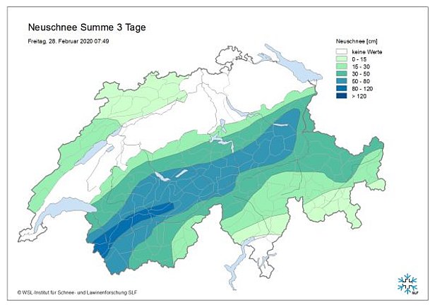 Sturmtief Bianca fegte in der Nacht auf Freitag mit stürmischem Westwind über die Schweiz und brachte verbreitet noch 10 bis 20 cm Schnee. In der Nacht liess der Schneefall aus Westen nach und so endete die dreitägige Niederschlagsperiode, die am Dienstag, 25.02. begonnen hatte und nur am Donnerstag, 27.02. kurz pausiert hatte (vgl. letzter Wochenbericht). Während dieser Periode fiel im Westen und Norden verbreitet mehr als 50 cm Neuschnee (Abbildung 1). Tagsüber war es dann recht sonnig, mit nachlassendem Wind. Am Nachmittag zogen aus Westen aber bereits wieder neue Wolken auf.