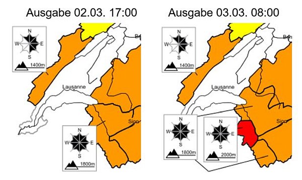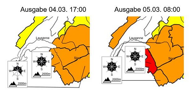 Wegen dem Neuschnee und dem Wind wurde für den Dienstag, 03.03. in den gesamten Schweizer Alpen und auch im westlichen Jura zunächst vor erheblicher Lawinengefahr (Stufe 3) und teilweise vor spontanen Lawinen gewarnt. Vor allem im Gebiet Trient fiel mit 60 bis 80 cm über Nacht deutlich mehr Schnee als erwartet. Deshalb wurde im Morgenbulletin von Dienstag, 03.03. für dieses Gebiet die Gefahrenstufe auf Stufe 4, grosse Lawinengefahr, erhöht (Abbildung 5).