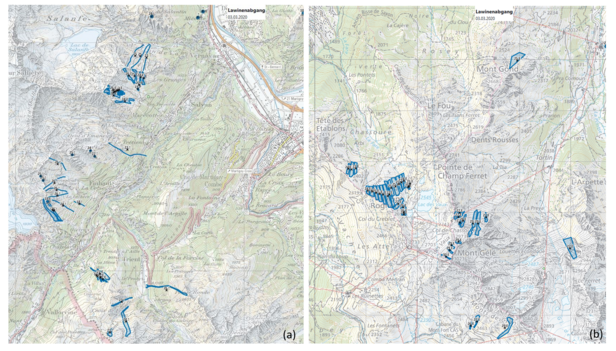 Mit den unerwartet heftigen Schneefällen war die Gefahrenstufe 4 bereits in der Nacht erreicht worden und der Höhepunkt der Lawinenaktivität zum Zeitpunkt der Bulletinausgabe um 8 Uhr bereits überschritten. Davon zeugten zahlreiche grosse Lawinen die in der Nacht spontan abgegangen und teilweise bis ins Grüne vorgestossen waren. Im Tagesverlauf wurde zudem erfolgreich gesprengt (Abbildung 6 und 7). Auch in den übrigen Regionen wurden zahlreiche Lawinenabgänge gemeldet. Der 03. März war der fünftaktivste Lawinentag des Winters (Abbildung 8). Sogar im Jura wurde eine Lawine von Personen ausgelöst. Ob die Person verschüttet wurde ist nicht bekannt (Abbildung 9).