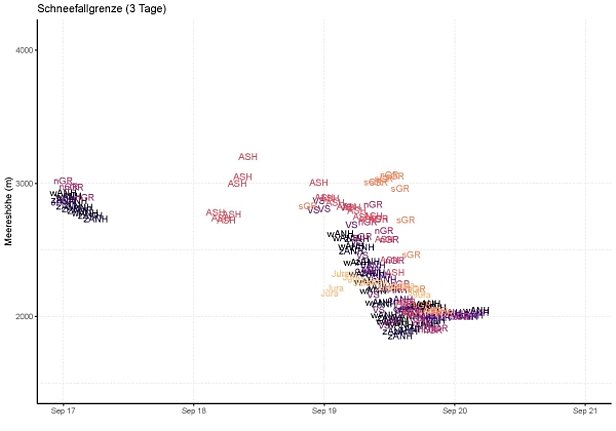 Die Schneefallgrenze sank am Montag mit dem Einsetzen der Niederschläge von rund 4000 m langsam ab. Am Dienstag sank sie allmählich unter 3000 m, und bis am Dienstagabend am zentralen Alpennordhang bis gegen 2000 m (vgl. Abb. 1.1). Danach stieg sie tagsüber jeweils an und erreichte am Donnerstag- und Freitag wieder gebietsweise 3000 m.