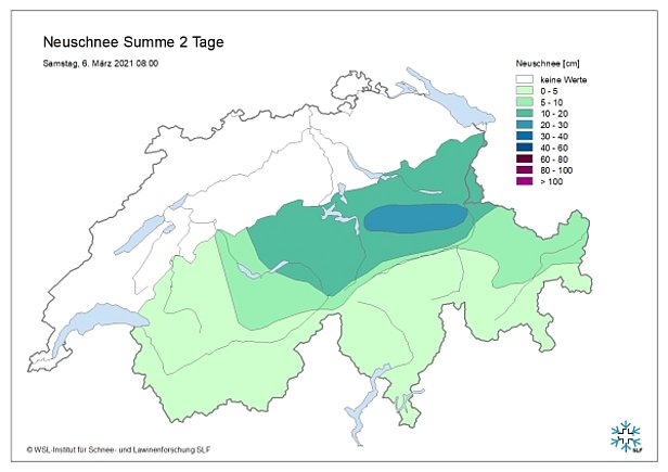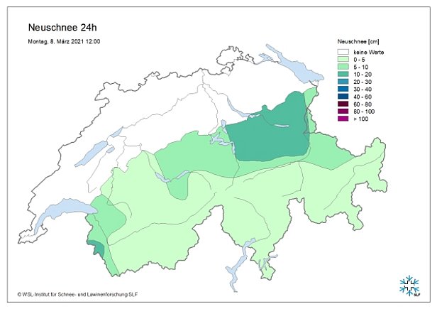 Schon wieder drehte das Wetter: erneut war es im Norden bewölkt und in der Nacht auf Montag fielen am Alpennordhang vom Schächental bis zum Pizol oberhalb von rund 1200 m nochmals 10 bis 20 cm Schnee (Abbildung 2). Im Laufe des Montag gab es Aufhellungen. Im Süden war es recht sonnig.