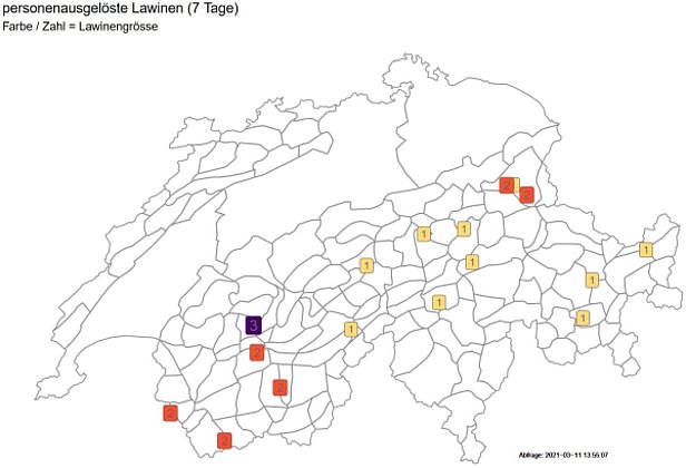In dieser Woche wurden 17 Lawinen gemeldet, die durch Personen ausgelöst wurden (Abbildung 5). Tödliche Unfälle ereigneten sich glücklicherweise keine.