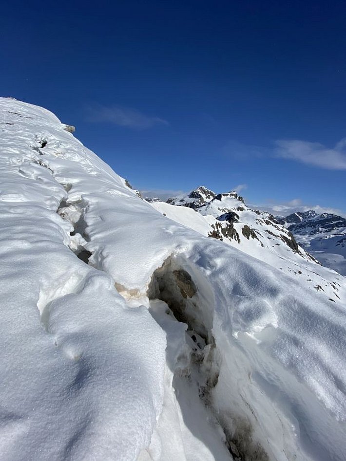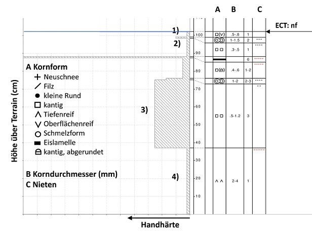 Vor allem in Graubünden und im Wallis waren weiterhin Schwachschichten im bodennahen Altschnee vorhanden (Abbildung 6), doch wurden keine in bodennahen Schwachschichten ausgelösten Lawinen mehr gemeldet. Auch wenn das schwache Fundament der Schneedecke derzeit offenbar kein grösseres Problem darstellt, dürfen wir diese Schichten trotzdem nicht aus den Augen verlieren: Vielleicht schon beim bevorstehenden Grossschneefall, spätestens aber mit der fortscheitenden Anfeuchtung, werden sie wieder aktiviert.